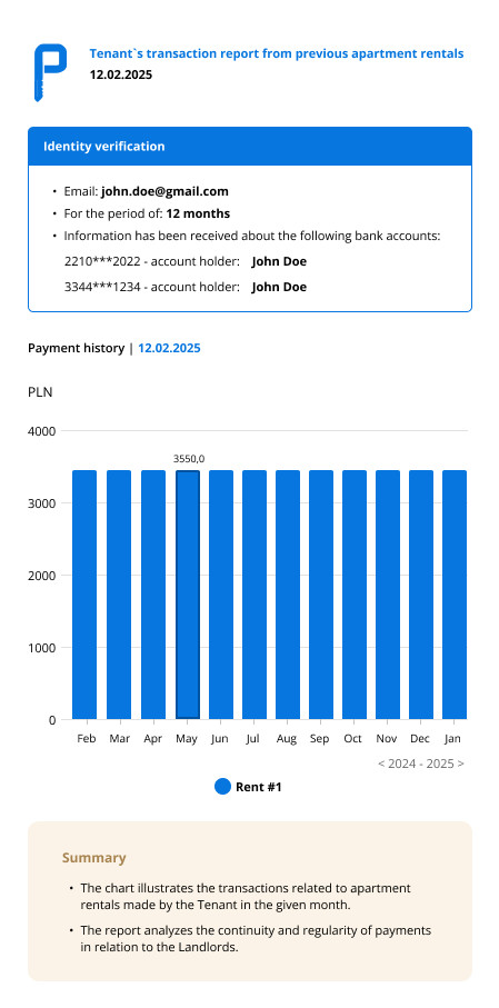 Poznaj nowe rozwiązanie stworzone z myślą o skutecznej, etycznej i przejrzystej weryfikacji najemców. Dzięki technologii otwartej bankowości umożliwia szybkie wygenerowanie Raportu Najmu, opartego na rzeczywistej historii transakcji bankowych najemcy. Taki raport daje właścicielowi nieruchomości jasną opowiedź na pytanie: czy mam do czynienia ze sprawdzonym najemcą, który regularnie wywiązuje się ze swoich zobowiązań?