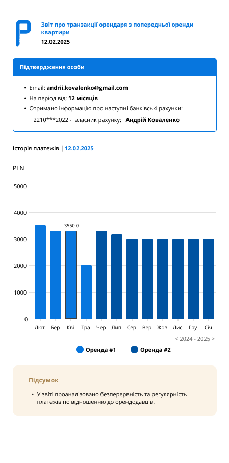 Raport Najmu zawiera kluczowe informacje, które pomagają właścicielowi wybrać sprawdzonego najemcę. Zamiast polegać wyłącznie na algorytmach kredytowych, decyzja opiera się na jasno przedstawionych, istotnych danych. Raport zwiększa poczucie bezpieczeństwa właściciela, a najemcy daje szansę na udowodnienie swojej wiarygodności i lepszą pozycję w negocjacjach.